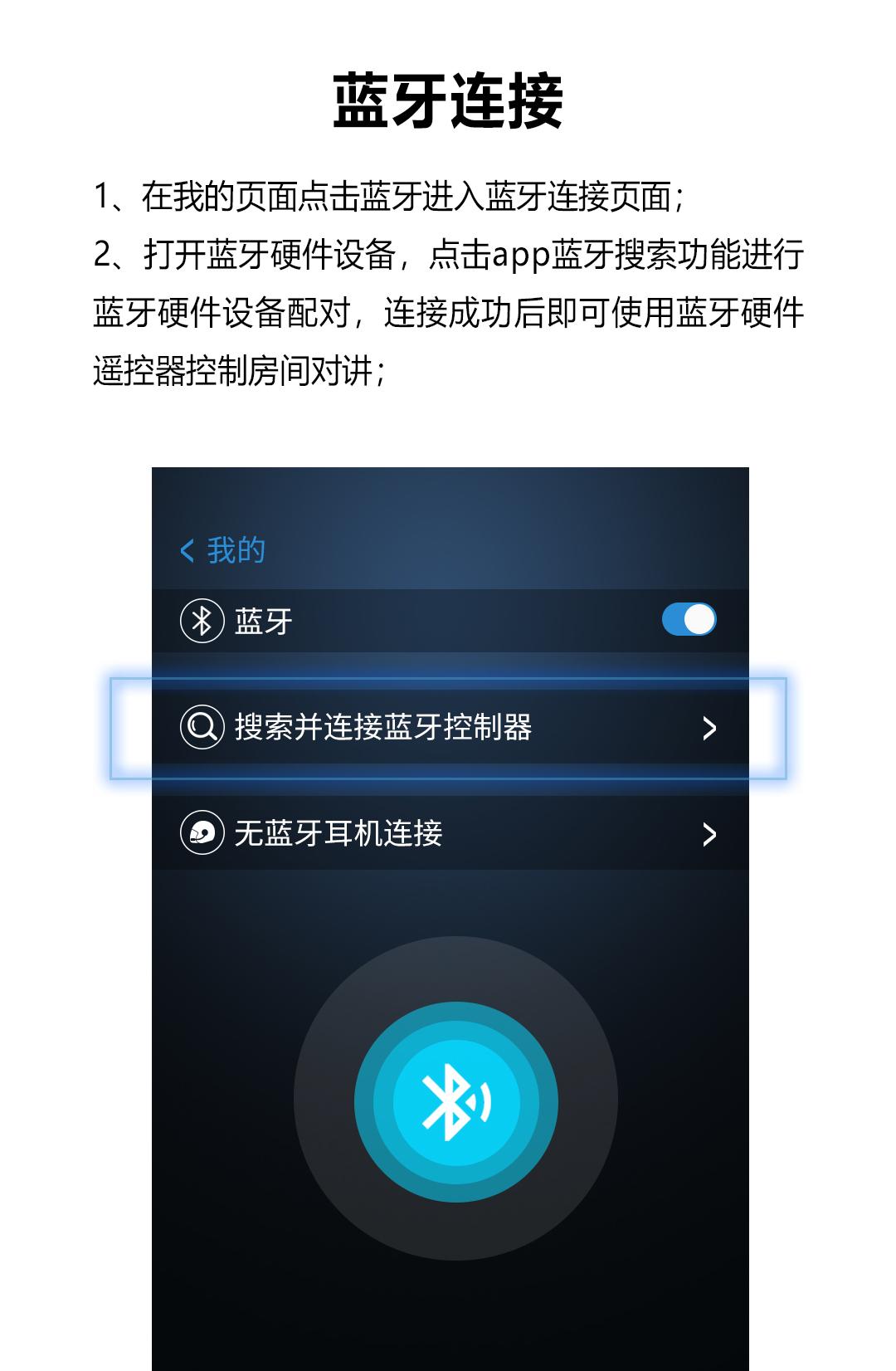 2、打开蓝牙硬件设备,点击app蓝牙搜索功能进行蓝牙硬件设备配对,连接成功后即可使用蓝牙硬件遥控器控制房间对讲;