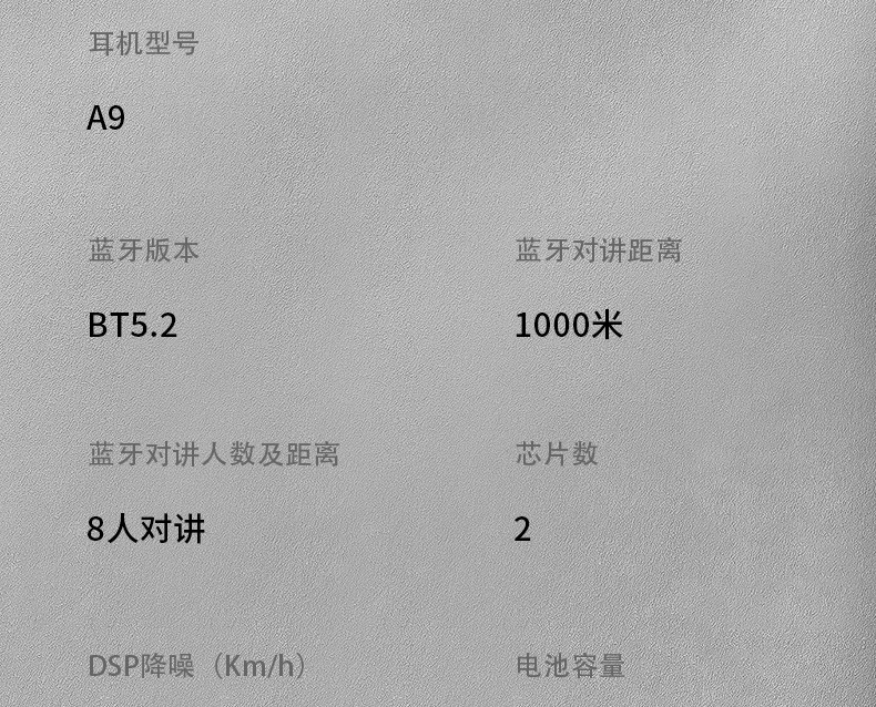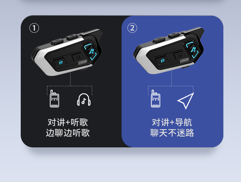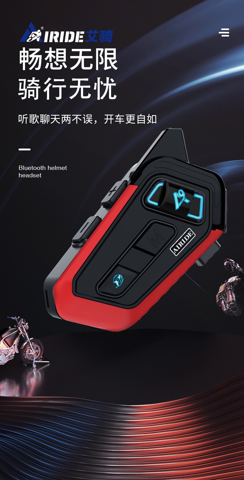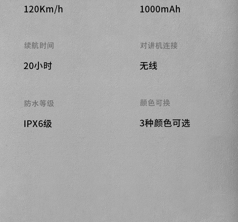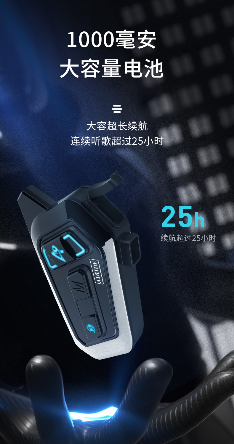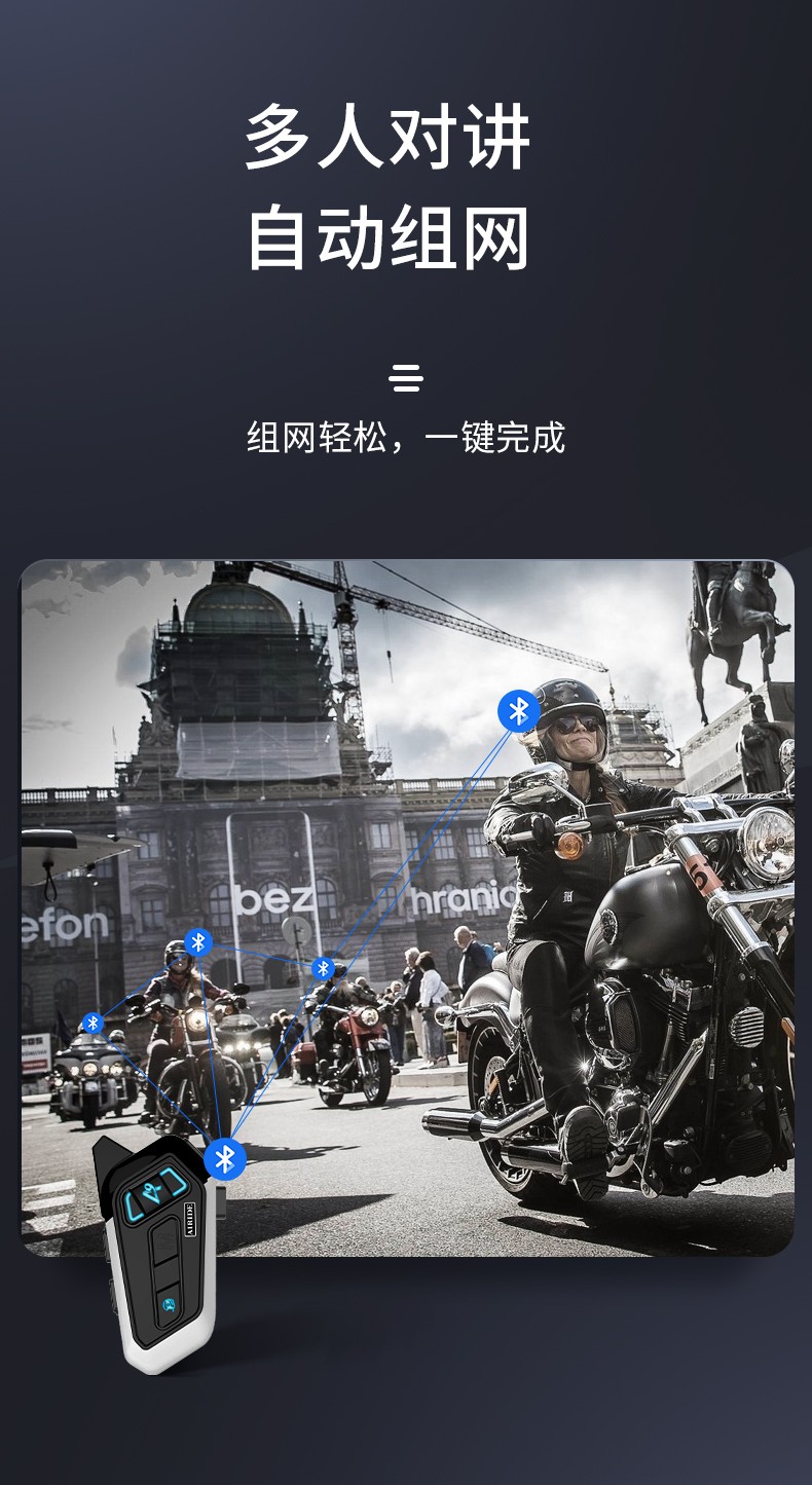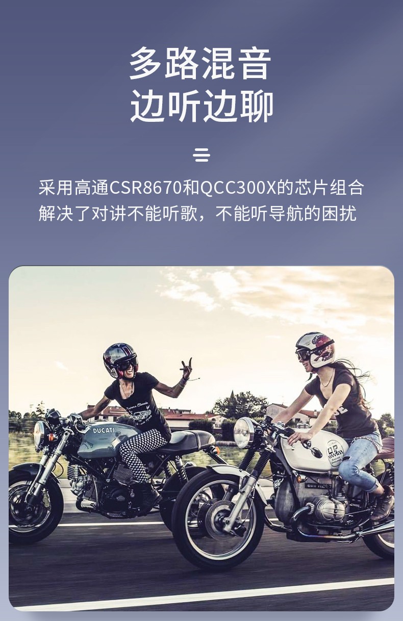 产品特点:蓝牙5.2芯片速度快,稳定传输;高通双芯片边听边聊,解决了对讲不能听歌,听导航的困扰;8人对讲,1000米对讲距离;OVP智能充电保护;软硬麦克风,适合各种头盔安装。