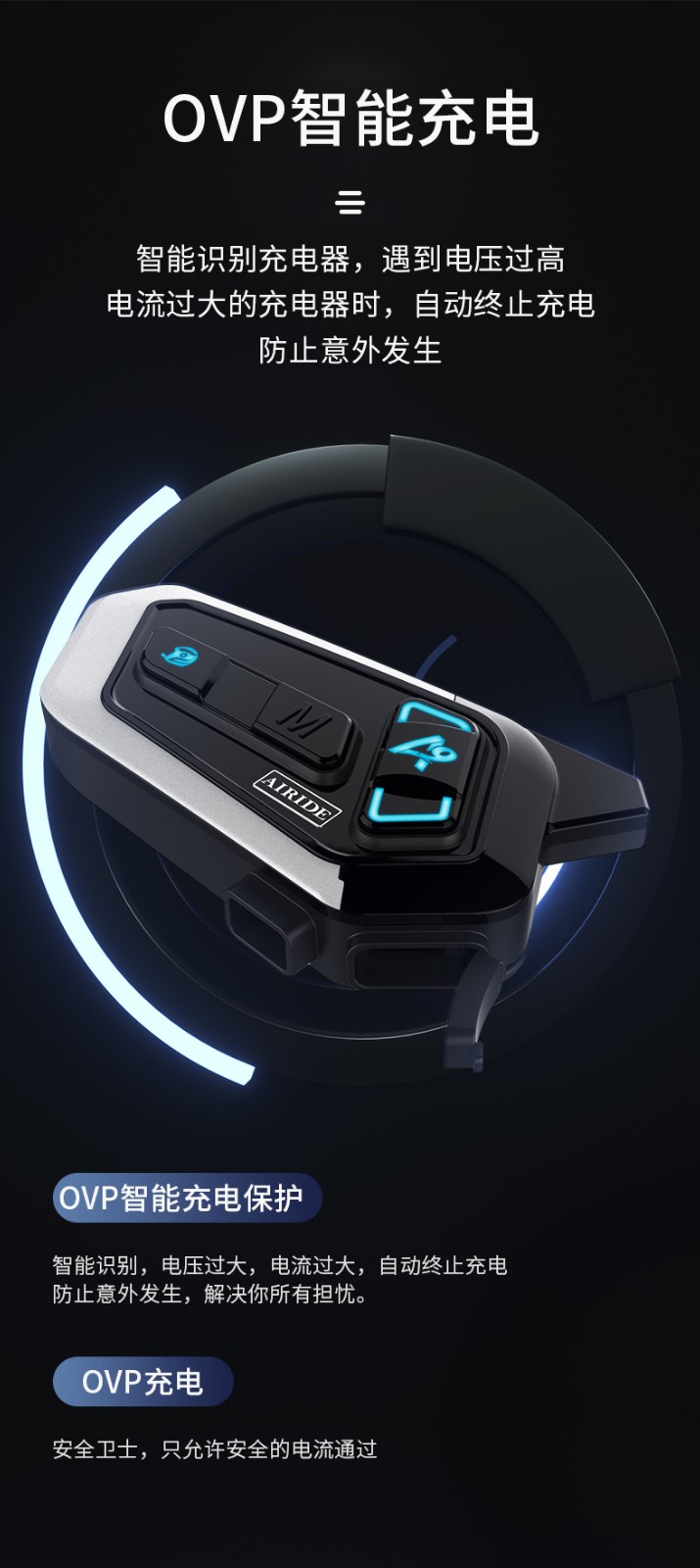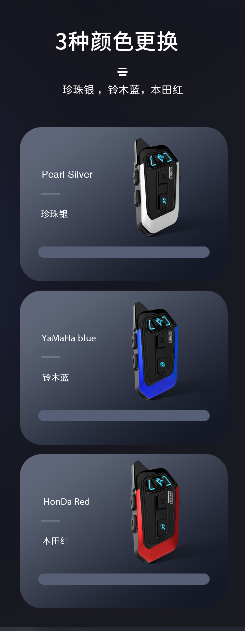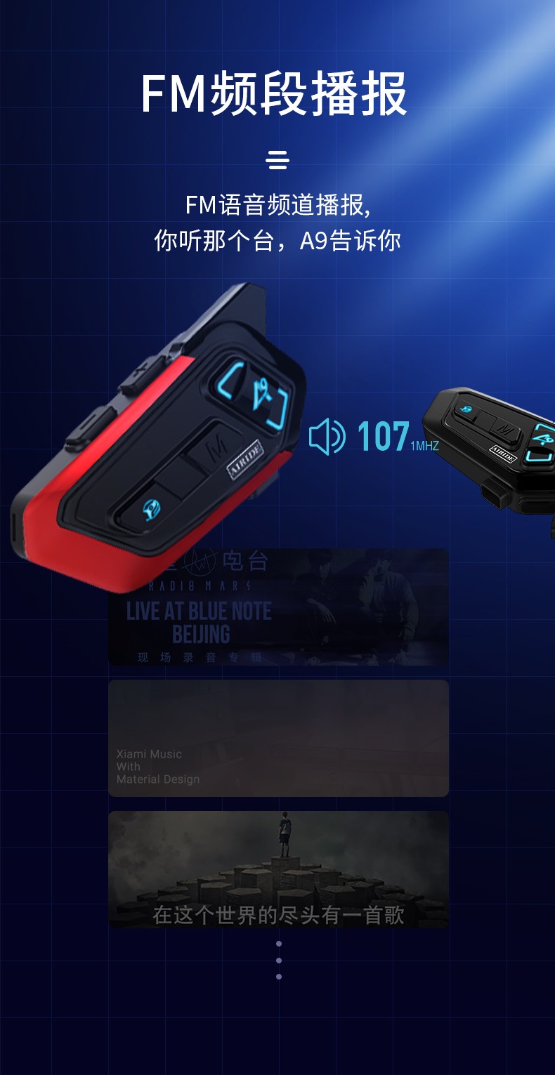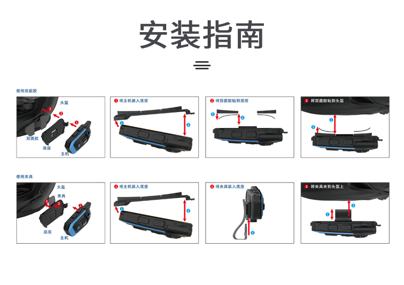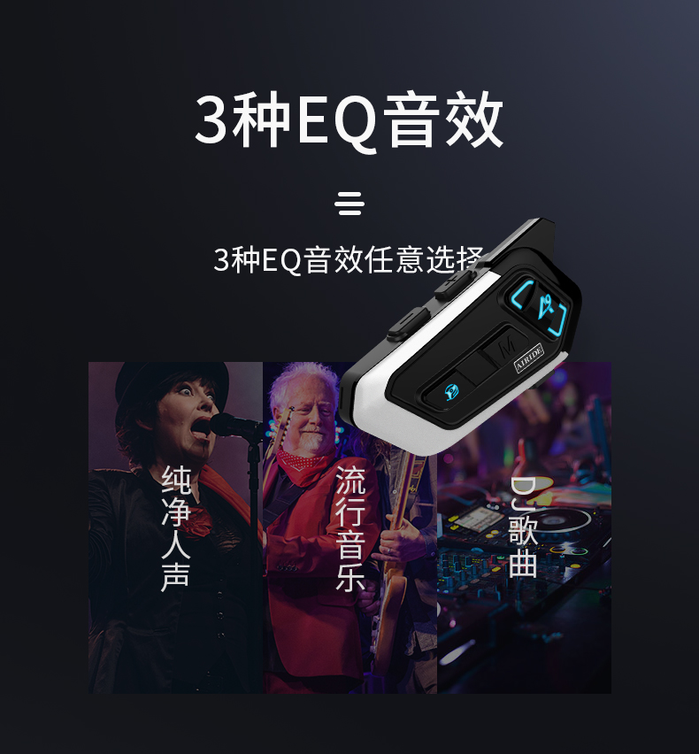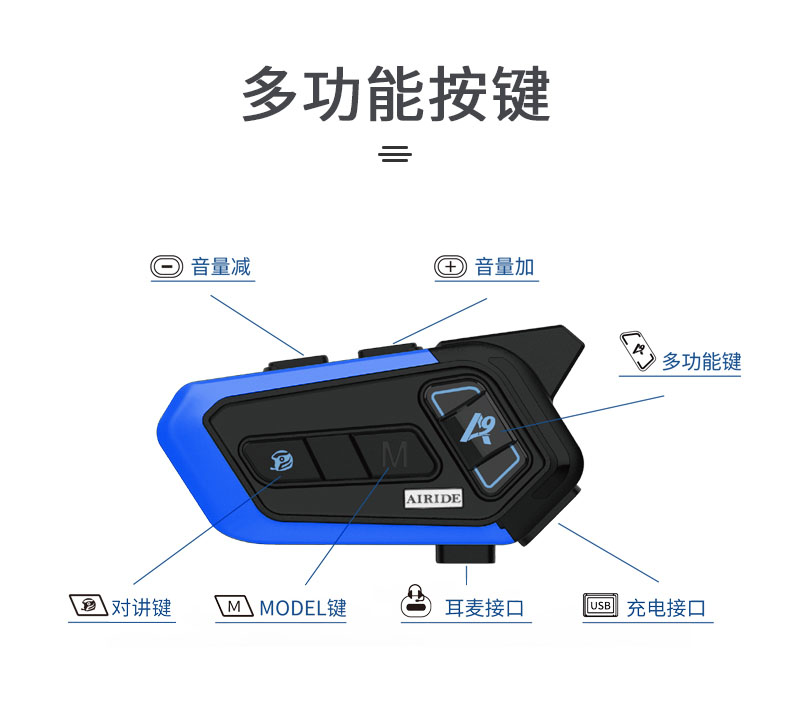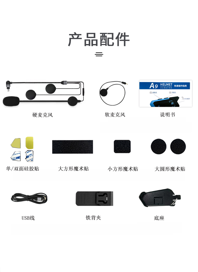 产品特点:蓝牙5.2芯片速度快,稳定传输;高通双芯片边听边聊,解决了对讲不能听歌,听导航的困扰;8人对讲,1000米对讲距离;OVP智能充电保护;软硬麦克风,适合各种头盔安装。