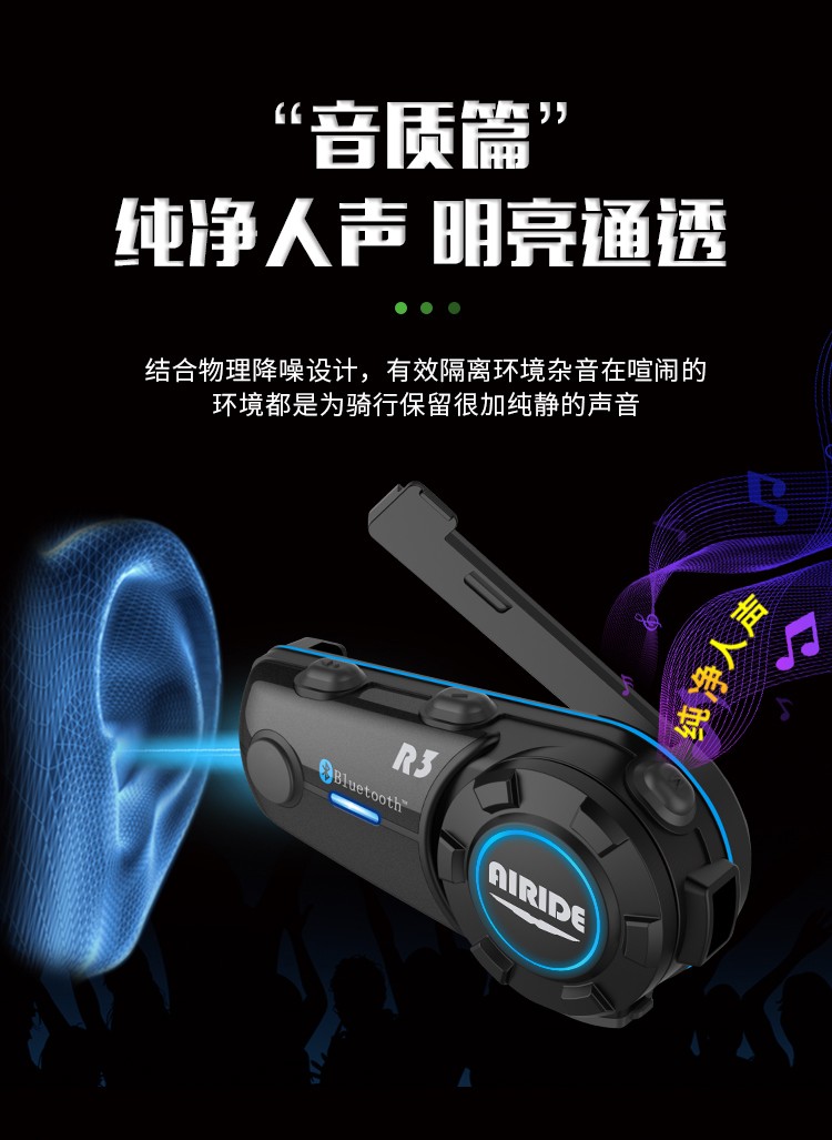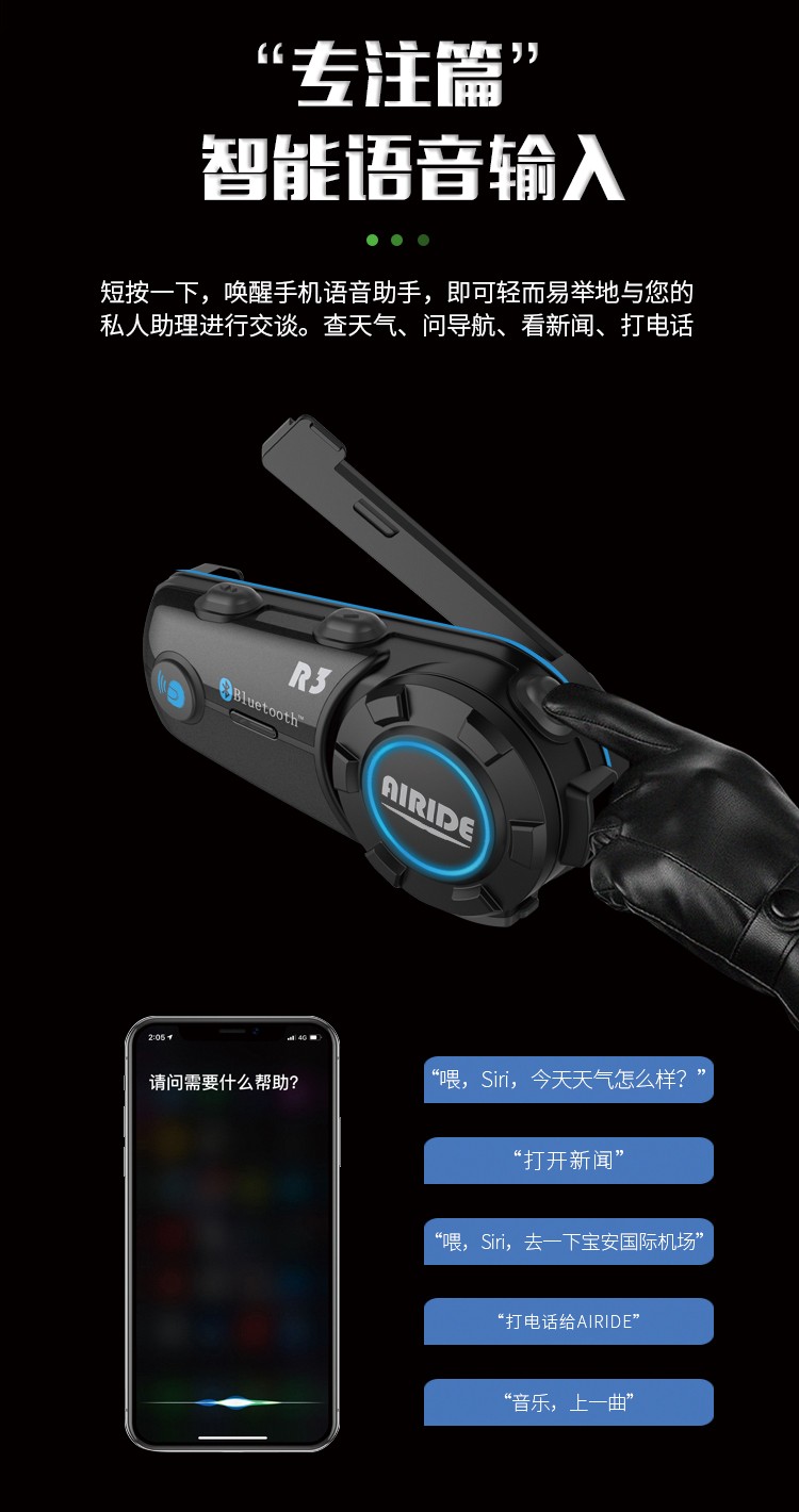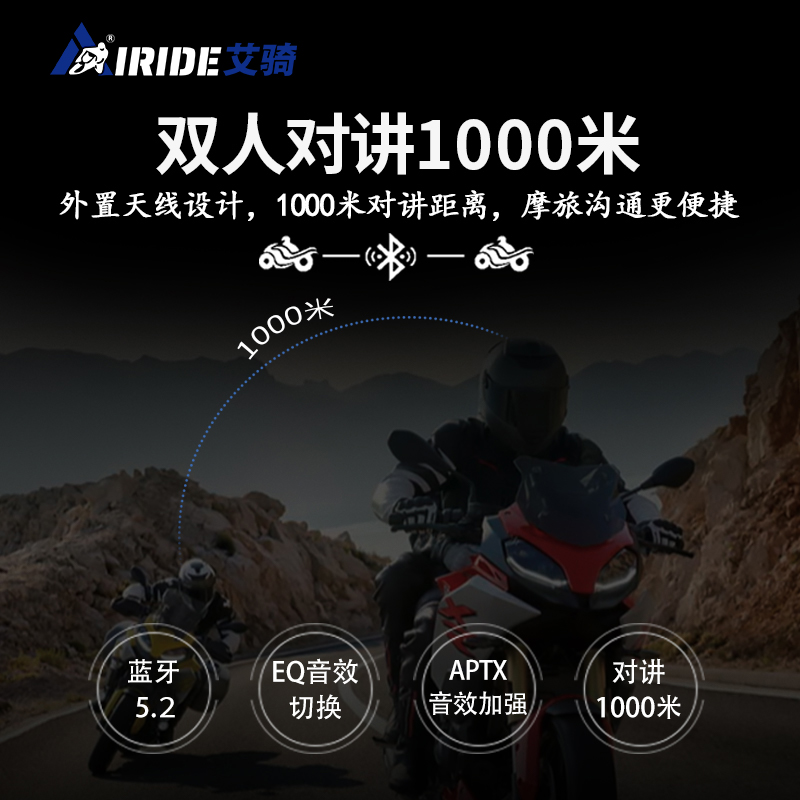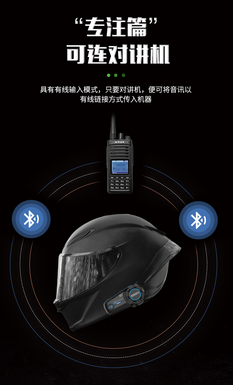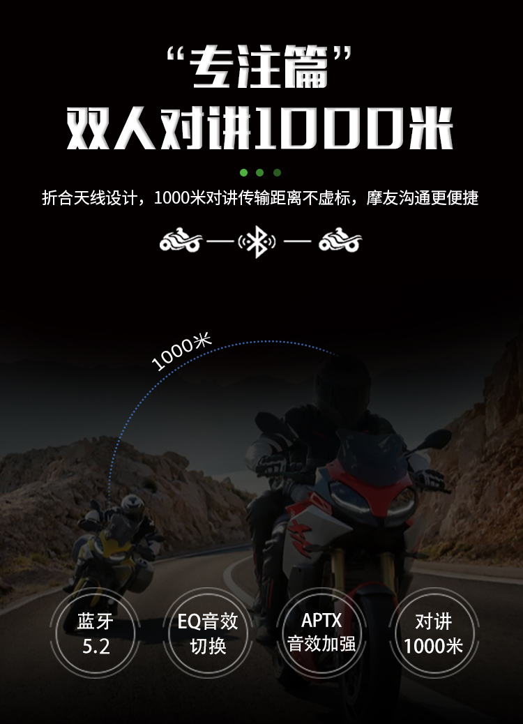 产品特点:满足两人摩旅1000米对讲距离;内置全频段收音机功能,不错过任何频道;与智能手机相连解放双手让骑行更安全(苹果SIR功能,安卓需先打开语音助手功能);智能播报(开机,关机,配对,电量播放等);外置音频接口通过K线连接对讲机实时沟通。